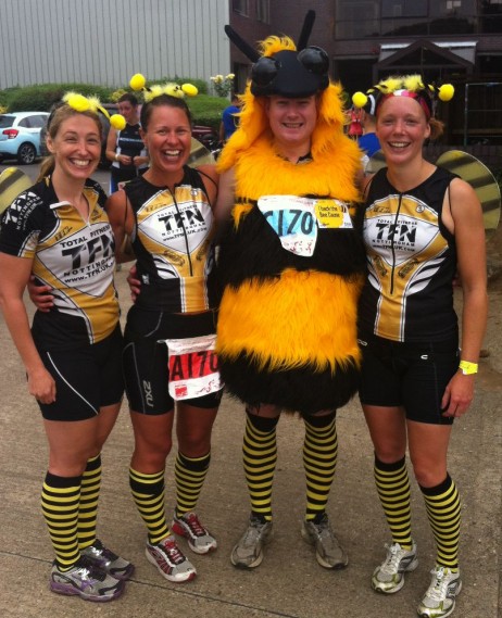 A team from a local triathlon club 'TFN' dressed as bees at a Club Relay at Holme Pierrepont on 24th/25th August 2013 promoting the Bee Cause.